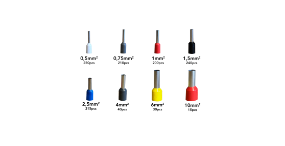 Composition du lot : 250pcs 0.5mm² / 210pcs 0.75mm² / 200pcs 1mm² / 240pcs 1.5mm² / 215pcs 2.5mm² / 40pcs 4mm² / 30pcs 6mm² / 15pcs 10mm²