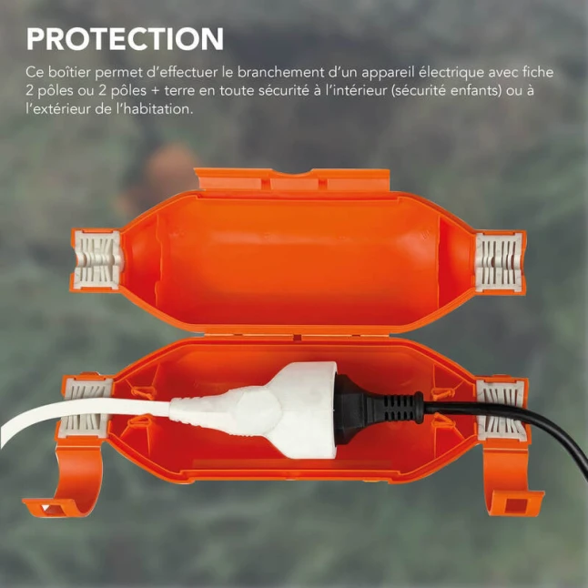 Ce boîtier de protection de prises électriques sécurise une connexion de rallonge et évite les débranchements accidentels. Il répond au problème fréquent des prises exposées aux chocs, à la poussière ou aux éclaboussures, notamment quand un appareil doit rester branché dehors ou dans un garage. Son plastique robuste et sa couleur orange bien visible facilitent le repérage. Vous gardez une connexion plus propre, mieux maintenue et plus sûre au fil des usages.
