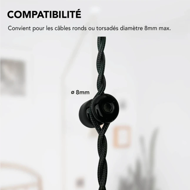 Le format est pensé pour les montages courants : diamètre extérieur 19 mm et hauteur 24 mm. Le passage accepte les câbles ronds ou torsadés jusqu’à 8 mm de diamètre maximum, ce qui couvre la plupart des câbles de luminaire. Cette précision évite les doutes au moment de choisir, notamment si vous changez de câble ou de suspension. Le passe-câble 19 mm sert aussi de finition propre lorsque plusieurs éléments doivent être alignés au plafond.