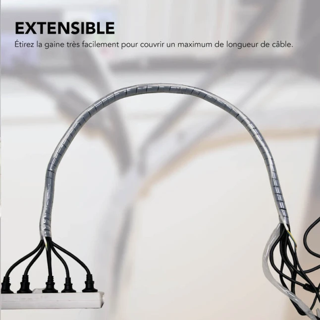 La gaine plastique extensible s’adapte à plusieurs tailles de faisceaux, du simple cordon d’alimentation à un regroupement de câbles plus épais. L’entrée et la sortie des fils peuvent se faire sur toute la longueur, pratique quand les connexions ne sont pas au même endroit. Cette gaine de regroupement de câbles 2,50 m apporte une finition régulière et stable, appréciée pour des installations propres et faciles à faire évoluer.