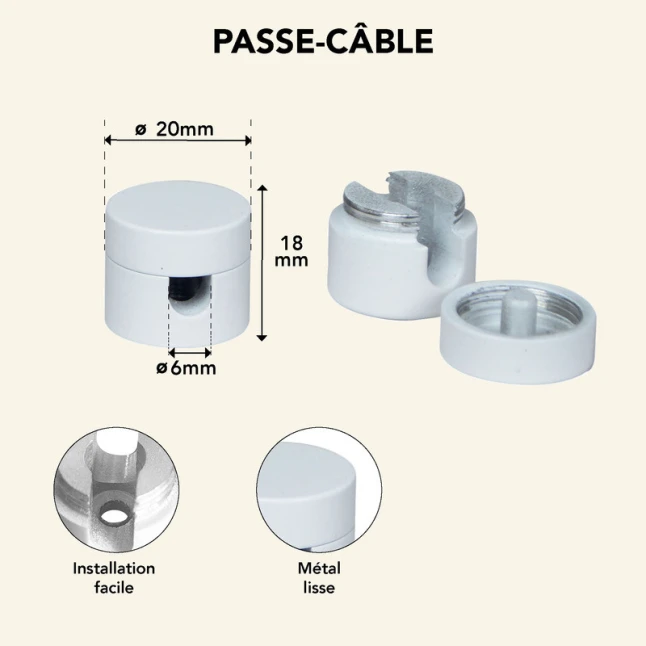Ce lot de 2 passe-câbles en aluminium blanc permet de guider et maintenir un ou plusieurs câbles d’un luminaire suspendu multi-descentes. Il répond à un problème fréquent : des câbles qui partent dans tous les sens et une sortie de plafond ou de mur peu nette. Le métal assure une tenue durable et une finition propre, tout en protégeant le passage du câble contre les frottements au niveau de l’orifice.