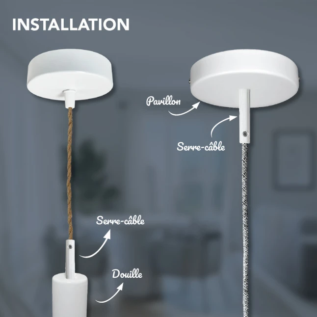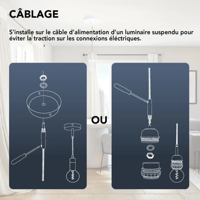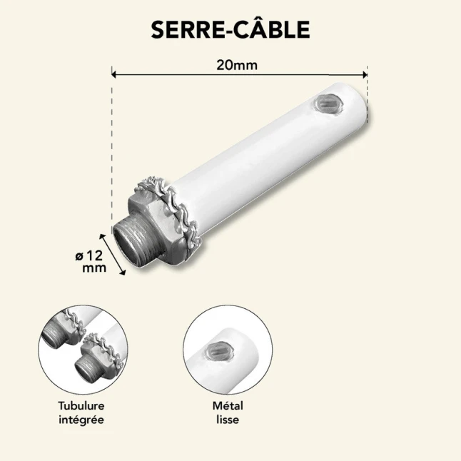 Ce serre-câble en métal blanc se place sur le câble d’alimentation d’un luminaire suspendu pour bloquer la traction. Il répond au problème courant d’un câble qui tire sur les connexions et finit par les desserrer, surtout lors d’un déplacement ou d’un réglage de hauteur. Le maintien mécanique est assuré par une vis de blocage, avec écrou et rondelle éventail pour une tenue stable dans le temps.