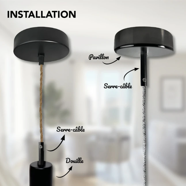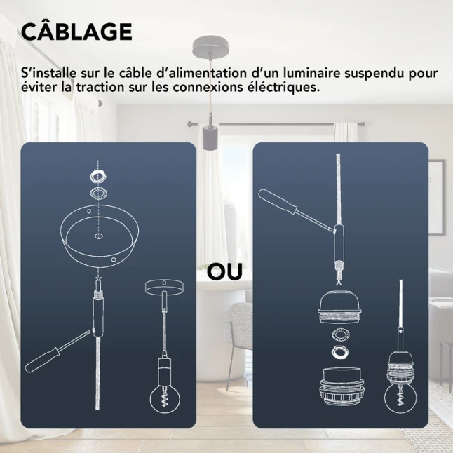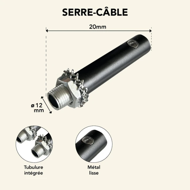 Ce lot de 2 serre-câbles métal noir se fixe sur le câble d’alimentation d’un luminaire suspendu pour limiter l’arrachement et protéger les connexions électriques. Il répond à un problème courant : un câble tiré ou vrillé peut desserrer les fils dans le bornier et créer des coupures. Le maintien est assuré par une vis de blocage, pour une retenue nette et stable. La finition noire reste discrète sur une suspension.