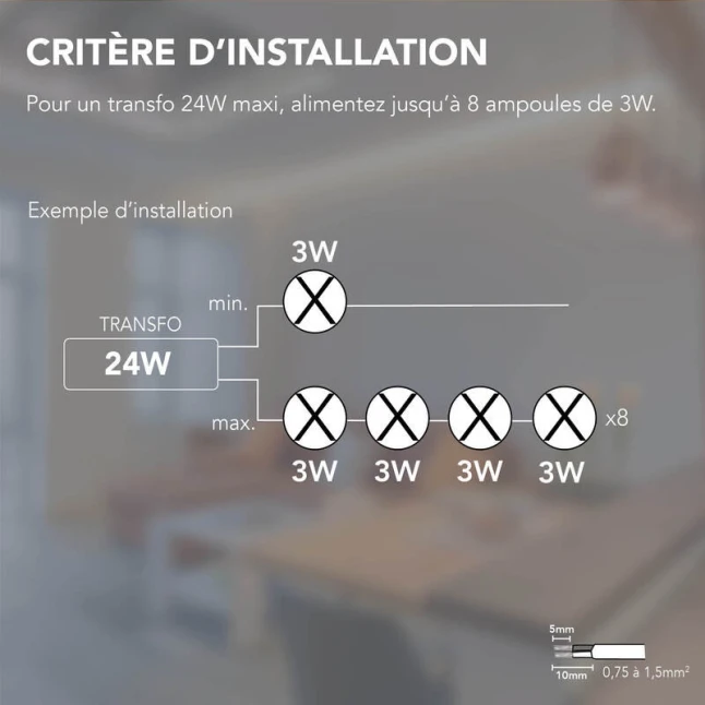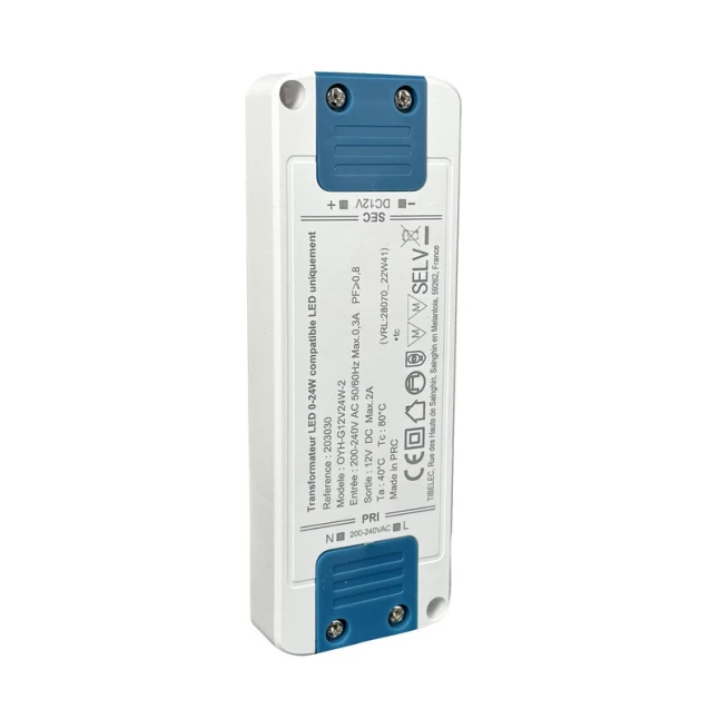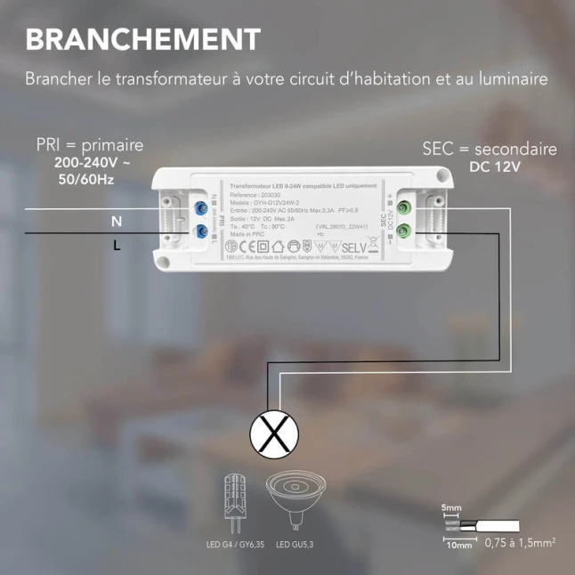 Pour lever les doutes sur la fiabilité, ce transformateur luminaire 24W intègre des protections contre la surcharge et les courts-circuits, utiles pour limiter les arrêts et les échauffements. La connexion se fait par câbles (non fournis) et accepte des sections de 0,75 à 2,5 mm², ce qui facilite l’adaptation à différents luminaires. La garantie 5 ans apporte une réassurance concrète, appréciable quand plusieurs points lumineux dépendent de la même alimentation.