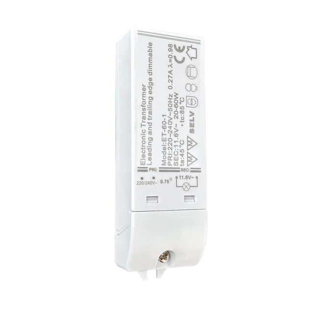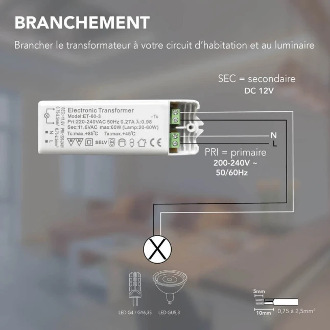 Ce transformateur électronique convertit la tension du secteur 230/240 V en 12 V très basse tension. Il est conçu pour les luminaires prévus pour une alimentation 12 V, avec ampoule halogène ou ampoule LED. Il répond au besoin classique d’un luminaire 12 V impossible à alimenter directement en 230 V. La sortie 12 V apporte une alimentation adaptée, pour garder le fonctionnement attendu du luminaire sans changement de câblage côté lampe.