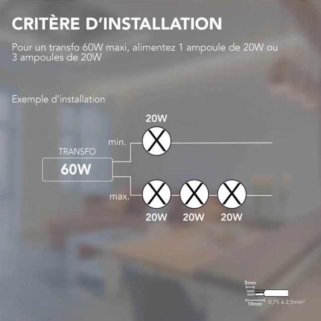 La plage de puissance 20 à 60 W couvre de nombreux montages, du spot simple aux ensembles de plusieurs lampes, selon la puissance totale installée. Il convient aux halogènes 12 V entre 20 et 60 W, et accepte aussi les LED à partir de 5 W lorsque le luminaire est prévu pour du 12 V. Cela évite le doute fréquent sur la compatibilité : vérifiez simplement que vos ampoules sont bien en 12 V et additionnez leurs watts.