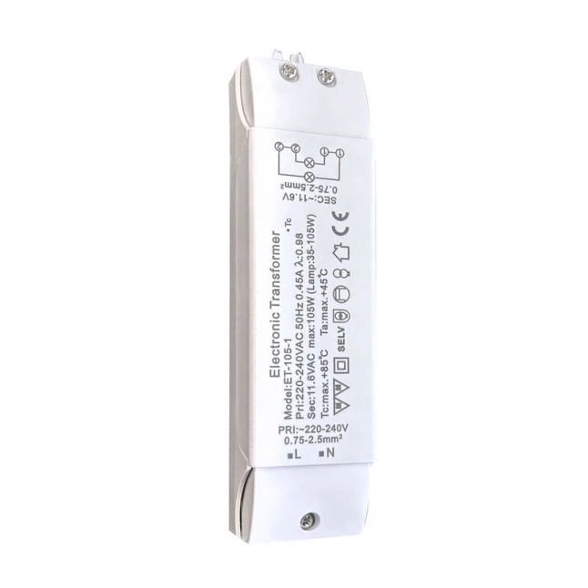 Ce transformateur électronique alimente un luminaire prévu pour fonctionner en 12 V. Il transforme le courant secteur 230/240 V en sortie 12 V, pratique pour remplacer un transformateur d’origine fatigué ou remettre en service un éclairage qui ne s’allume plus correctement. Compatible avec les luminaires 12 V équipés d’ampoules halogènes ou LED, il apporte une alimentation plus stable et évite les recherches de panne inutiles.