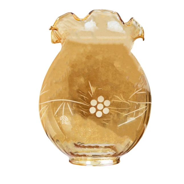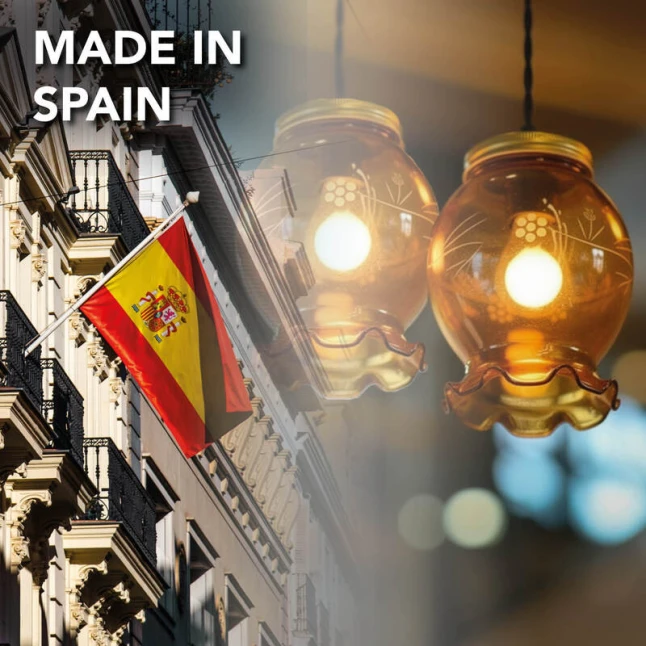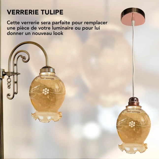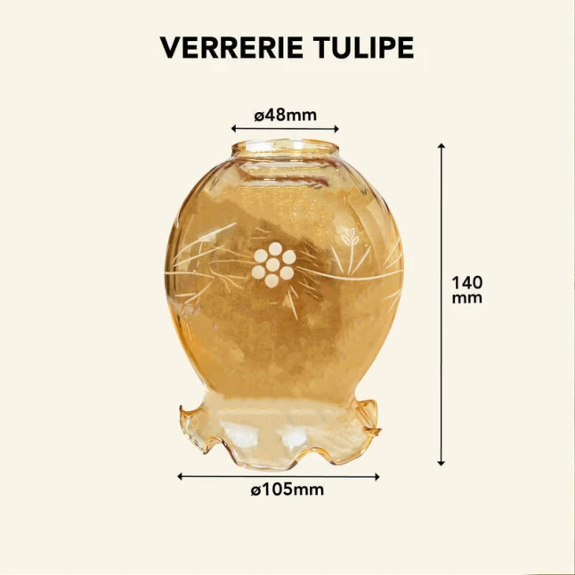 Fabriqué en verre, ce globe tulipe résiste bien à l’usage normal et conserve sa couleur ambrée dans le temps. La surface satinée se nettoie facilement et les gravures restent nettes, ce qui évite l’effet “vieilli” après quelques mois. Pour les besoins réguliers de maintenance, le diamètre 140 mm et la fixation par griffe permettent de standardiser les remplacements et de gagner du temps lors des interventions.