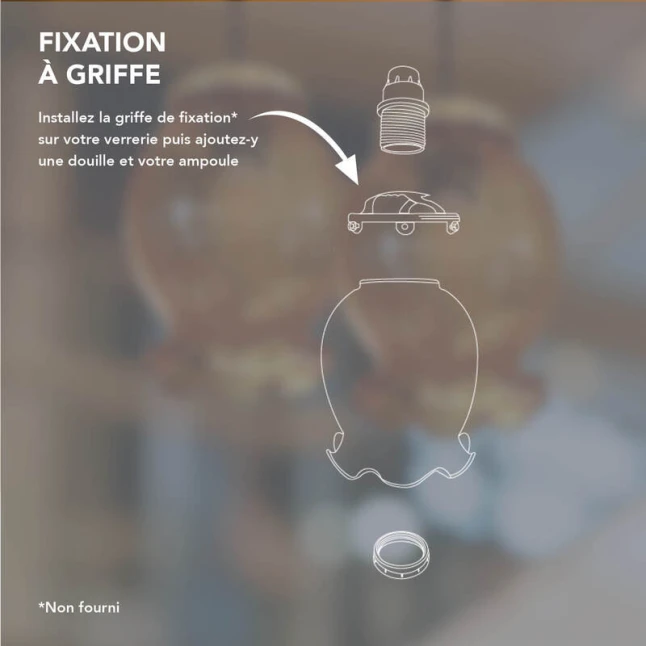 Avec un diamètre de 140 mm, cette verrerie est adaptée aux usages courants en lustre et applique murale. La fixation est prévue avec une griffe, un système très répandu pour maintenir un abat-jour en verre. Si vous hésitez sur la compatibilité, ce format standard et la forme tulipe facilitent le remplacement d’une verrerie cassée ou dépareillée, sans devoir changer la structure du luminaire.