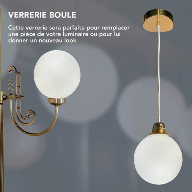 Cette verrerie en verre opale blanc est pensée pour remplacer un globe abîmé ou pour rafraîchir l’aspect d’un luminaire existant. Sa forme boule diffuse la lumière de façon plus douce et limite l’éblouissement, utile dans une entrée, un couloir ou au-dessus d’une table. Le verre blanc opalin apporte un rendu homogène et discret, tout en restant facile à nettoyer au quotidien.