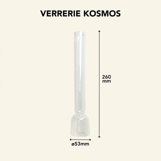 Pour lever le doute de compatibilité, ce modèle est un verre haut de 260 mm avec un diamètre de 53 mm. Ces mesures aident à vérifier rapidement l’ajustement avec votre lampe à pétrole Kosmos ou compatible, sans approximation. La forme haute est pensée pour correspondre aux verreries typiques de ce format. C’est un choix pratique autant pour un remplacement ponctuel que pour maintenir un petit stock de verrerie de remplacement sur chantier ou en atelier.
