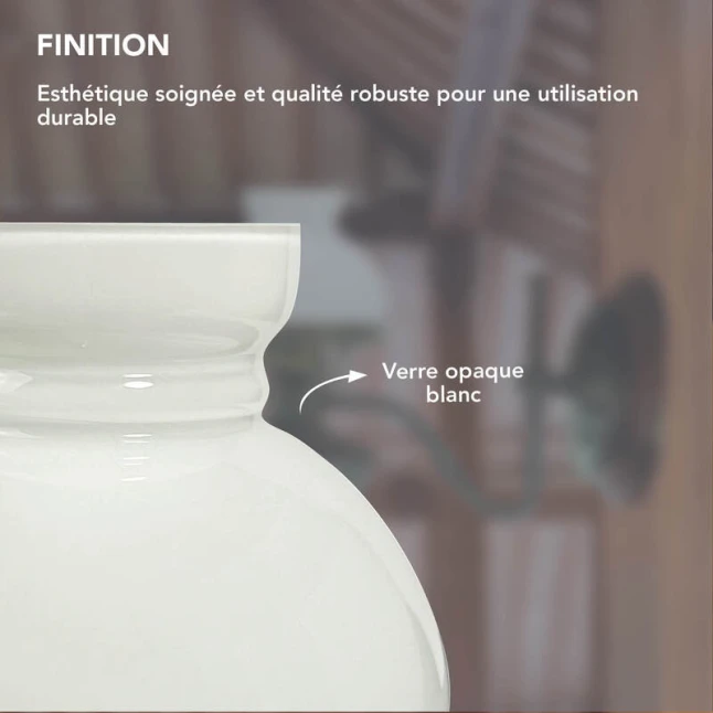 Fabriqué en verre, cet abat-jour offre une finition propre et une bonne tenue dans le temps. Le blanc opaque masque les petites irrégularités de lumière et limite les reflets directs, tout en gardant un rendu clair. Cette verrerie pour applique et lustre se nettoie facilement et conserve son aspect sobre. Pour les interventions rapides, c’est une pièce utile à avoir en dépannage, afin de remettre un luminaire en état sans changer la structure.
