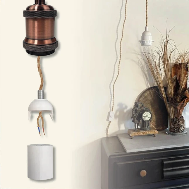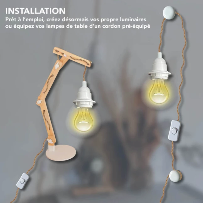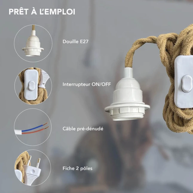 Ce kit pré-câblé vous évite les recherches de pièces séparées quand vous créez ou rénovez un luminaire. Il réunit un câble torsadé en corde ton naturel, un interrupteur en ligne, une fiche 2 pôles et une douille blanche. Idéal pour une suspension, une baladeuse ou une lampe avec ou sans abat-jour. Vous gagnez du temps et vous obtenez un ensemble propre, cohérent et discret.