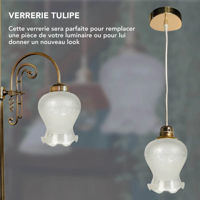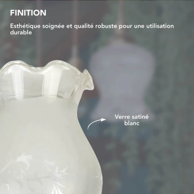 Cette verrerie en verre satiné blanc gravé est pensée pour remplacer un abat-jour cassé ou jaunissant, sans changer tout le luminaire. La forme tulipe diffuse la lumière de façon plus homogène et limite l’éblouissement, utile dans une pièce de vie comme dans un couloir. Le verre satiné apporte un rendu discret et propre, tout en laissant passer suffisamment de lumière pour un éclairage confortable.