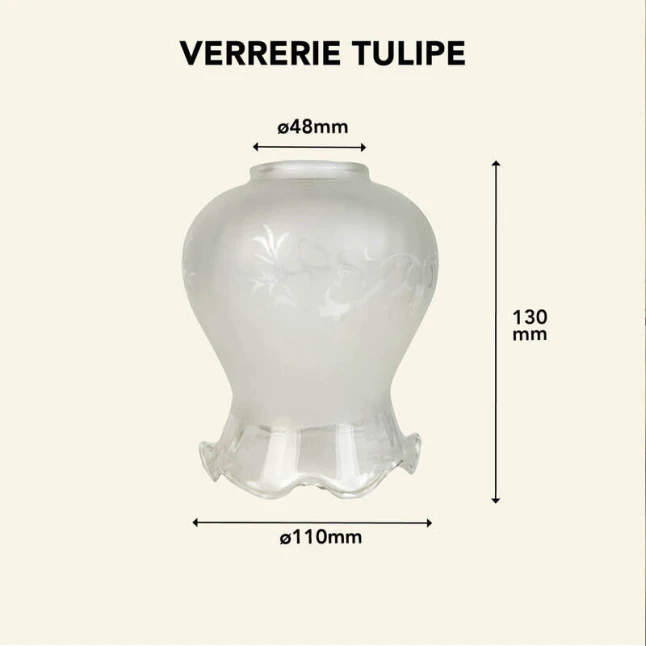 Le matériau en verre offre une bonne tenue dans le temps et ne se déforme pas avec la chaleur normale d’une ampoule. La surface satinée et la teinte blanche aident à masquer les petites traces et gardent un aspect net plus longtemps. Ce verre tulipe 130 mm convient aussi aux besoins courants d’entretien et de remplacement en série, avec une référence stable pour retrouver la même verrerie sur plusieurs points lumineux.