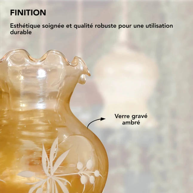 Le verre satiné diffuse la lumière de façon homogène et limite l’éblouissement, tout en gardant un bon niveau d’éclairage. La teinte ambrée réchauffe l’ambiance et le motif gravé ajoute du relief même lorsque la lampe est éteinte. Cette tulipe en verre convient aux usages du quotidien et met en valeur de nombreuses ampoules courantes, avec un rendu plus confortable qu’un globe transparent.