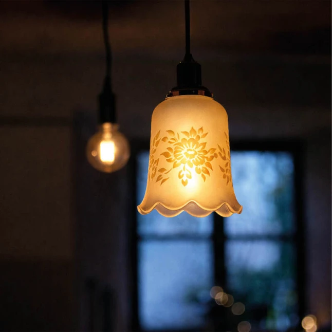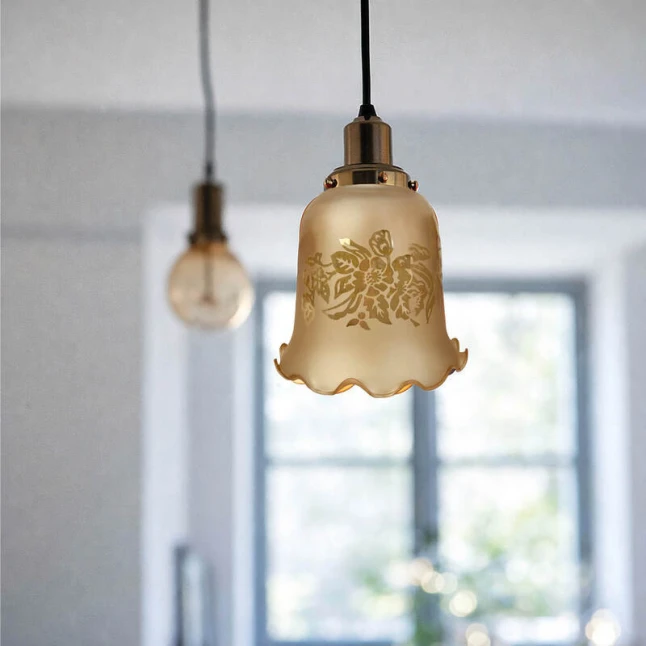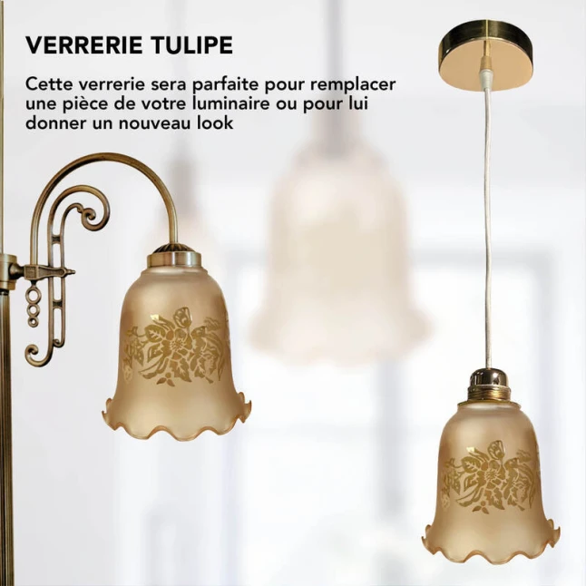 La finition satinée diffuse la lumière et limite l’éblouissement, ce qui répond au point de douleur fréquent des ampoules trop visibles. La teinte ambrée réchauffe l’ambiance et atténue les reflets directs, tout en restant compatible avec des sources LED courantes. Le verre gravé apporte un détail décoratif subtil, visible de près, qui modernise facilement un luminaire existant sans changer sa structure ni ses éléments électriques.