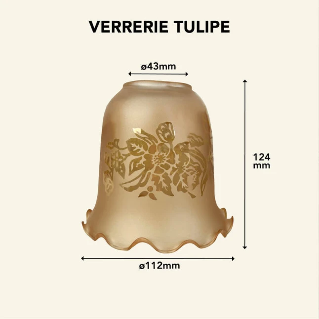 Ce verre tulipe en verre satiné ambré et gravé est pensé pour remplacer une verrerie cassée ou jaunie, sans changer tout le luminaire. Il convient aussi bien pour un lustre que pour une applique, afin d’unifier le style d’une pièce. Son diamètre 113 mm aide à vérifier rapidement l’encombrement et à éviter les mauvaises surprises au déballage. La fixation se fait avec une griffe, comme sur de nombreux modèles.