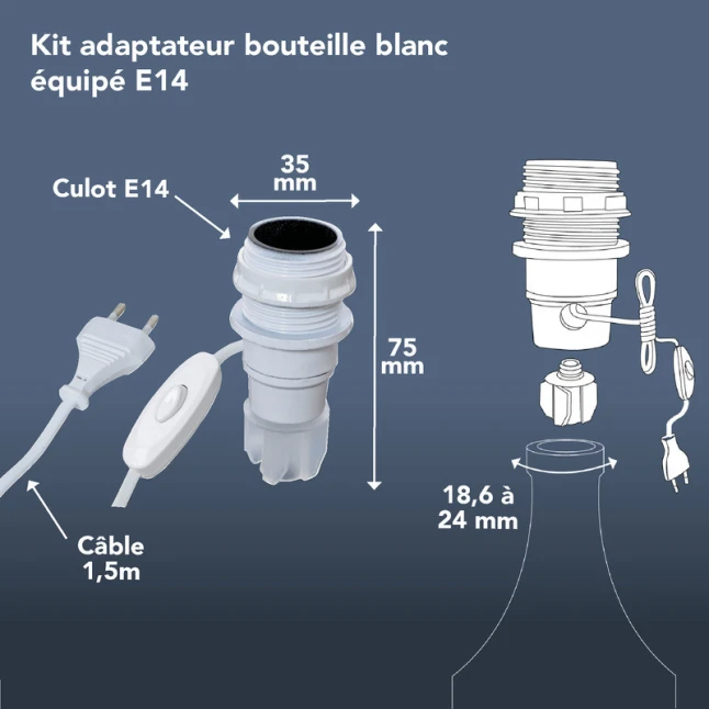 Le point qui bloque le plus souvent est la compatibilité avec le goulot. Ici, l’ouverture doit être comprise entre 18,6 mm et 24 mm de diamètre, ce qui couvre de nombreux formats de bouteilles et de vases courants. Le format E14 vous laisse le choix parmi de nombreuses ampoules adaptées, sans chercher un culot spécifique. La finition plastique blanc s’intègre facilement dans des projets de création, modification ou réparation de luminaire.