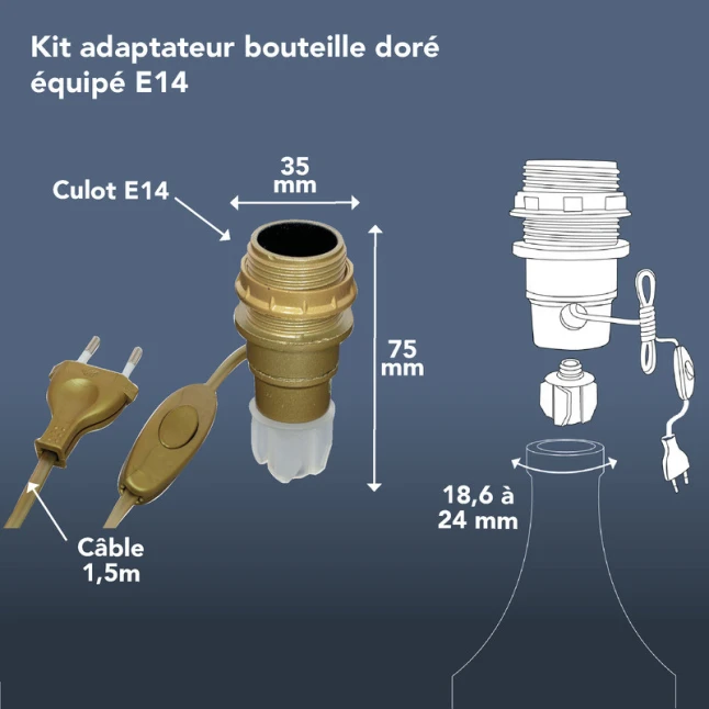 Ce kit adaptateur bouteille doré permet d’équiper rapidement une bouteille ou un vase pour en faire un luminaire décoratif. Il apporte une finition propre et homogène, tout en restant discret sur votre création. La douille E14 accepte les ampoules courantes à petit culot, ce qui évite la question de compatibilité au moment de choisir l’éclairage. Idéal pour une création, une modification ou une réparation de lampe.