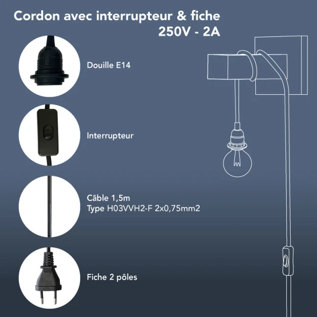 Ce kit cordon pré-équipé permet de créer ou remettre en service une lampe à poser, une suspension ou une applique avec une douille E27. Il répond au besoin classique de rénovation et de DIY quand on veut un montage propre, sans multiplier les achats. Le câble tissu noir apporte une finition soignée et discrète. La fiche 2 pôles se branche sur une prise standard pour une mise en service simple.