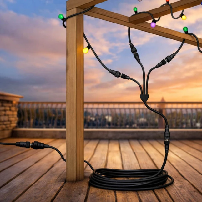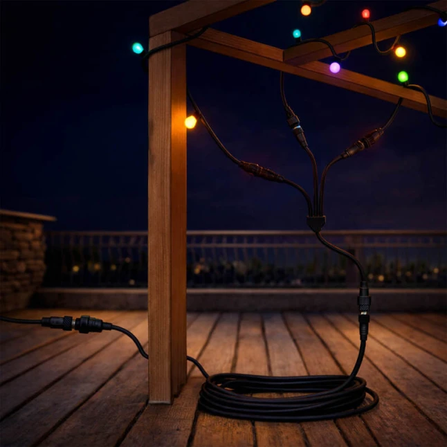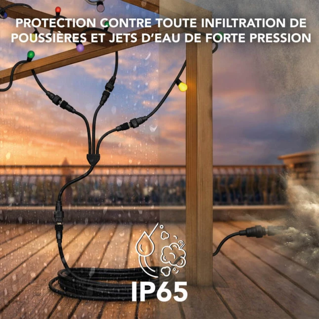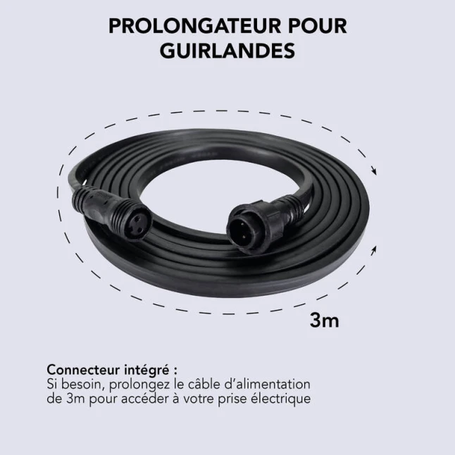 Ce prolongateur de 3 m vous permet d’allonger une guirlande connectable quand l’arrivée électrique est trop loin. Fini les câbles trop courts qui limitent la déco sur une terrasse, un balcon ou dans le jardin. La rallonge pour guirlande extérieure conserve une liaison propre entre deux éléments, sans tirer sur les connecteurs. Sa couleur noire se fait discrète sur un mur, une pergola ou une clôture.