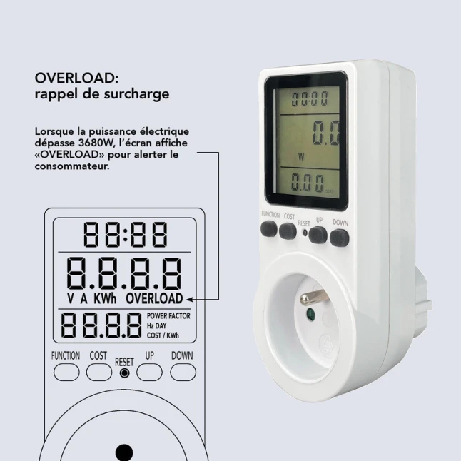 Ce compteur de consommation électrique digital se branche entre la prise et l’appareil pour visualiser immédiatement ce qui consomme vraiment. Son écran large facilite la lecture, même à distance, et le voyant de fonctionnement confirme que la mesure est active. Il répond à un besoin fréquent : comprendre une facture qui augmente et repérer rapidement un appareil énergivore, qu’il s’agisse d’un radiateur d’appoint, d’un congélateur ou d’un outil.