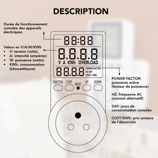Ce wattmètre prise affiche les informations utiles sans jargon : tension (V), fréquence (Hz), courant (A), puissance instantanée (W), énergie consommée (kWh) et coût total en €. Il permet aussi de suivre le coût sur la période 1 et la période 2 pour comparer deux durées ou deux usages. Vous pouvez ainsi vérifier l’impact réel d’un appareil en veille, d’une charge ou d’un cycle de fonctionnement.