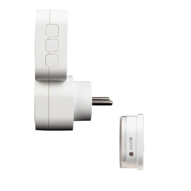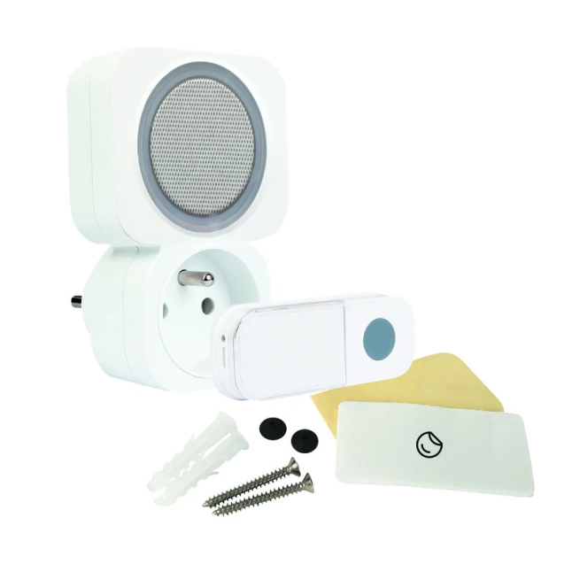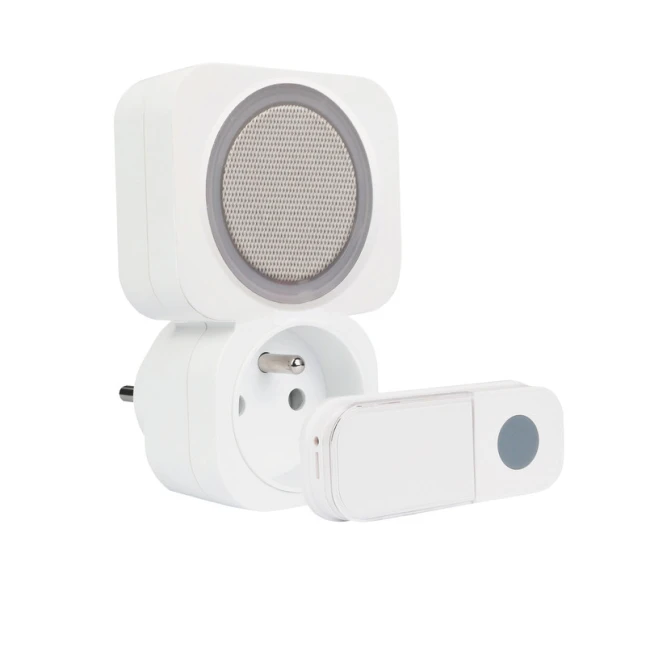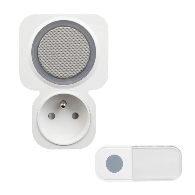 Ce carillon sans fil enfichable se branche simplement sur une prise murale et trouve sa place dans n’importe quelle pièce. Son format blanc en plastique reste discret. Le point fort, souvent recherché, est la prise intégrée en façade : le carillon occupe la prise, mais vous conservez un branchement disponible pour une lampe, un chargeur ou un petit appareil. Une solution concrète quand on manque déjà de prises à proximité de l’entrée.