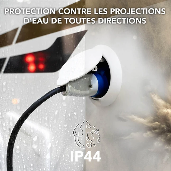 Conçu pour une utilisation en extérieur, il est classé IP44, ce qui signifie qu’il est protégé contre les projections d’eau venant de toutes directions. C’est rassurant lorsque la prise se trouve dehors ou dans un coffret de camping. Il accepte jusqu’à 16 ampères, soit 3680 W maximum, pour alimenter la plupart des appareils du quotidien. Le câble H07RN-F 3G1,5 mm² assure une section adaptée aux besoins courants.