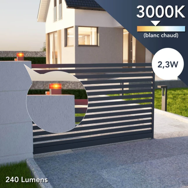 Avec 2,3W et 240 lumens, elle offre une lumière visible sans surconsommer, idéale pour signaler l’ouverture ou la fermeture. Sa teinte 3000K blanc chaud apporte un rendu agréable et non agressif, tout en restant bien perceptible. Le verre incolore conserve l’aspect du clignotant et la diffusion attendue. Si vous hésitez sur la puissance, 2,3W LED correspond à un usage de signalisation plutôt qu’à un éclairage principal.