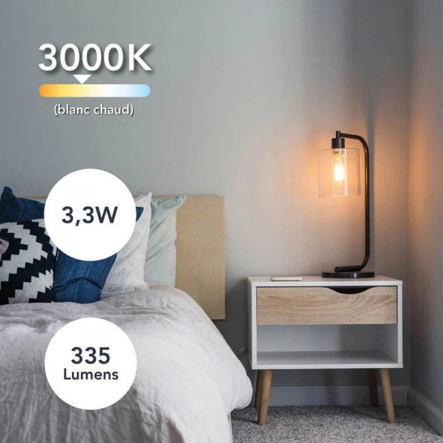 Cette ampoule LED à culot E14 est pensée pour les veilleuses et les petits luminaires. Elle diffuse une lumière blanc chaud 3000 K, agréable et rassurante, sans éblouir. Avec 335 lumens pour seulement 3,3 W, vous obtenez un éclairage efficace tout en limitant la consommation. Son verre incolore et sa couronne transparente gardent un rendu discret, pratique quand l’ampoule reste visible dans un petit abat-jour ou une veilleuse.