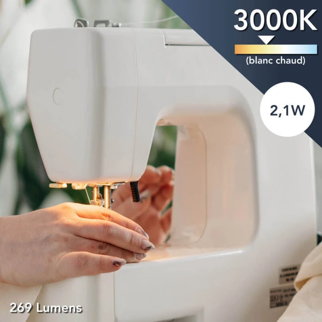 Une ampoule LED 2,1 W chauffe généralement moins qu’une ampoule traditionnelle, ce qui améliore le confort près de la zone de couture. Elle convient aux remplacements réguliers grâce à une consommation réduite et une durée d’utilisation adaptée aux sessions répétées. Pour les utilisateurs exigeants, la combinaison 269 lm et 3000 K apporte une lecture plus constante des matières et des couleurs, tout en limitant les changements d’ampoule fréquents.
