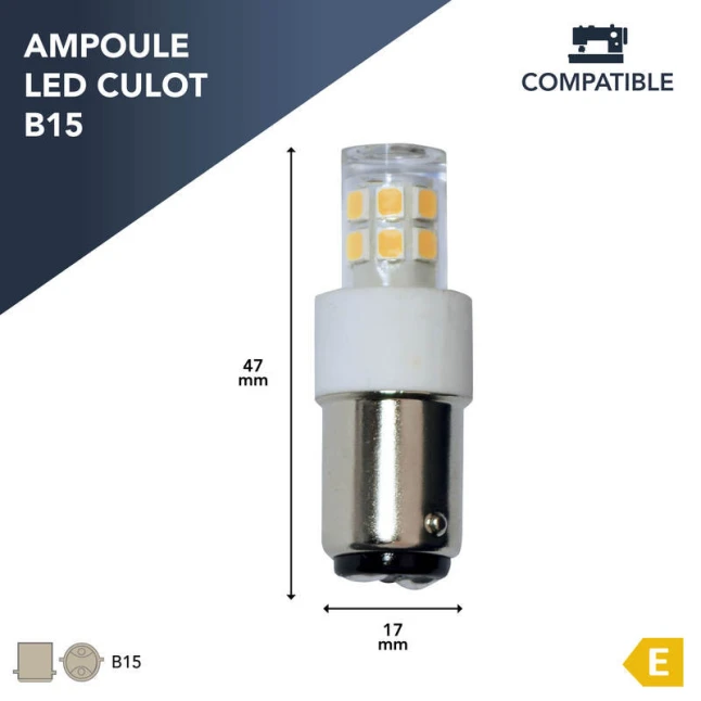 Conçue pour les machines à coudre équipées d’un culot B15, cette ampoule se choisit facilement quand on hésite entre plusieurs bases. Elle fonctionne en 240 V, un standard fréquent, ce qui évite les mauvaises surprises au moment du remplacement. Le verre étant souvent absent sur ce type de lampe, son corps en plastique incolore laisse bien passer la lumière et s’intègre discrètement dans le logement.