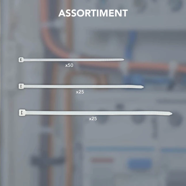 Cet assortiment de 100 colliers de câblage blancs permet de fixer proprement des fils, gaines et petits faisceaux en quelques secondes. Le pack réunit trois formats utiles pour s’adapter aux besoins courants : 50 colliers 100x2,5 mm, 25 colliers 150x3,6 mm et 25 colliers 250x4,8 mm. Pratique quand on hésite sur la bonne longueur ou la bonne largeur, sans acheter plusieurs sachets séparés.