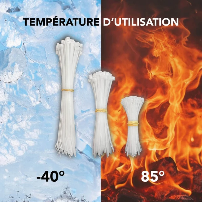 Fabriqués en nylon, ces serre-câbles résistent aux variations de température de -40 à +85 °C. Leur denture intérieure assure un serrage régulier et limite le risque de glissement une fois le collier fermé. La couleur blanche se fait discrète sur des câbles clairs et dans des zones visibles. Vous pouvez les utiliser aussi bien en intérieur qu’en extérieur, pour des besoins de fixation simples et durables.