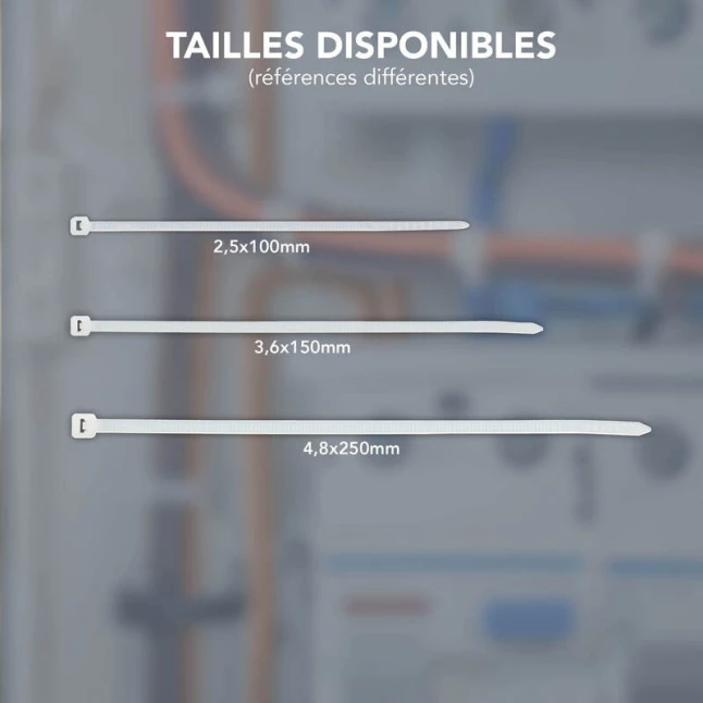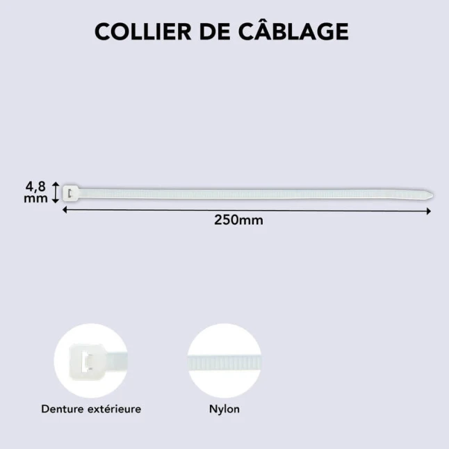 Avec une longueur de 250 mm et une largeur de 4,8 mm, ces colliers nylon conviennent pour des faisceaux jusqu’à environ Ø 40 mm, pratique pour regrouper plusieurs câbles d’un même cheminement. Si vous hésitez sur la taille, ce format long couvre la plupart des besoins courants tout en restant simple à manipuler. Le conditionnement en lot de 100 évite les ruptures et assure une uniformité de serrage et d’aspect.