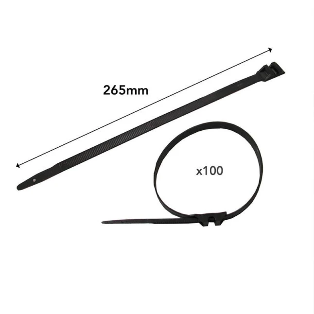 Le lot de 100 serre-câbles est adapté quand il faut traiter plusieurs points de fixation d’un coup, ou garder du stock pour les dépannages. Les dimensions 265 mm de longueur et 9 mm de largeur sont clairement définies, ce qui aide à vérifier rapidement la compatibilité avec l’encombrement disponible et le diamètre du faisceau. Pour les chantiers comme pour le bricolage, ce format limite les variations et fait gagner du temps.