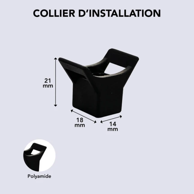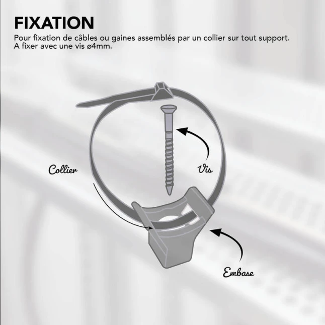 Chaque embase se fixe avec une vis de diamètre 4 mm, un standard facile à trouver. Vous pouvez y passer un collier de fixation pour maintenir des câbles électriques, fils, gaines légères ou petits faisceaux, selon votre besoin. Si vous hésitez sur la compatibilité, retenez que le principe est universel : une embase à vis, puis un collier pour serrer et maintenir. La couleur noire reste discrète sur la plupart des supports.