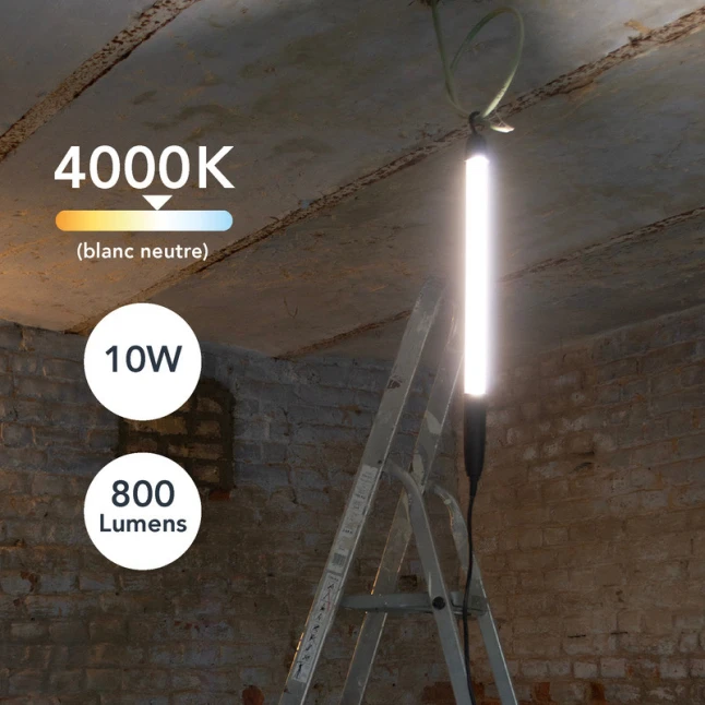 Cette baladeuse LED filaire apporte un éclairage d’appoint efficace quand une pièce ou un coin d’atelier manque de lumière. Sa puissance de 10W délivre 800 lumens, utile pour voir les détails sans éblouir. La teinte blanc neutre 4000K donne un rendu naturel, pratique pour bricolage, entretien et contrôle visuel. La technologie LED limite la consommation et chauffe peu. Produit contenant une source lumineuse, exempté d’étiquette énergie.