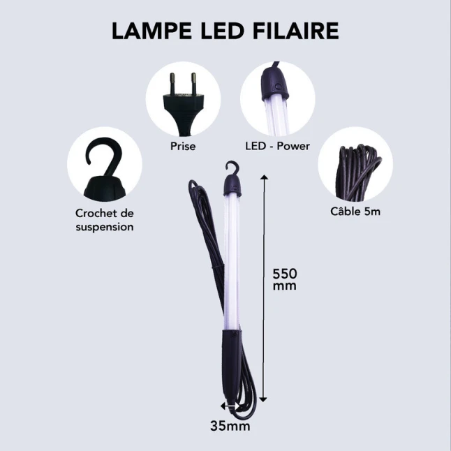 Le câble long de 5 mètres répond au problème classique de la prise trop éloignée, sans devoir déplacer tout l’espace de travail. Le crochet intégré permet d’accrocher la lampe baladeuse sur un support et de garder les mains libres pour percer, visser ou vérifier un moteur. Cette lampe de travail portable se déplace facilement entre garage, cave, chantier ou coffre de voiture, tout en gardant une lumière homogène au bon endroit.