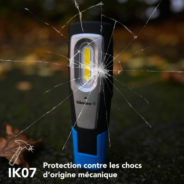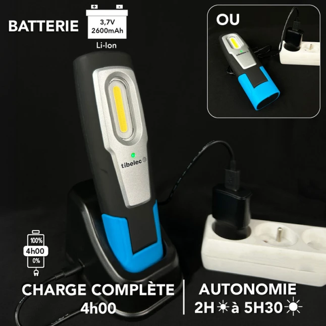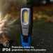 La recharge se fait simplement sur son socle de recharge USB, compatible avec les alimentations USB courantes et une batterie externe. La protection IP54 limite l’entrée de poussières et résiste aux projections d’eau, ce qui rassure en atelier ou en extérieur. La résistance aux chocs IK07 réduit le risque de casse lors des manipulations. Garantie 3 ans, pour un usage régulier et serein.
