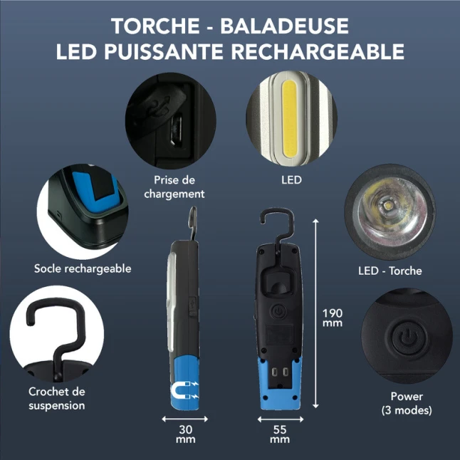 Cette baladeuse LED rechargeable délivre 600 lumens pour 6W, pratique quand une lampe classique ne suffit pas dans un garage, un coffre de voiture ou un placard. Les 2 sources lumineuses permettent de choisir entre un éclairage large pour voir la zone de travail et un mode torche pour viser un détail. Le format compact en plastique noir se transporte facilement et reste prêt à l’emploi à la maison comme sur chantier.