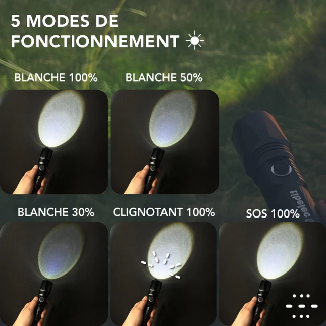 Réglage du faisceau lumineux par mouvement de la tête permettant d'ajuster la luminosité selon vos besoins.
