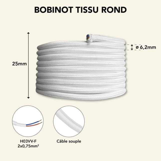 La longueur 25 m en bobine est pratique quand on veut refaire plusieurs luminaires, moderniser une suspension ou remplacer un cordon usé sans multiplier les achats. Vous coupez la longueur nécessaire en gardant une réserve pour les prochains projets. Pour les usages réguliers, ce format fait gagner du temps et assure une cohérence de rendu sur une série d’installations. Le câble rond tissu blanc limite aussi les marques visibles sur le passage du fil.