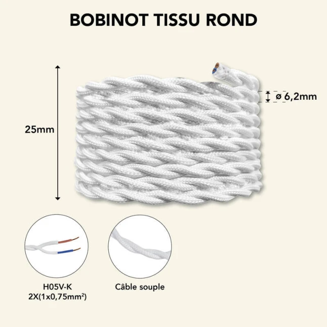 Le diamètre de 6,2 mm facilite le choix des accessoires compatibles, notamment les passe-câbles, serre-câbles et certaines entrées de douille prévues pour un cordon textile. Ce point répond au doute fréquent sur l’encombrement du câble dans les éléments décoratifs. La gaine en tissu améliore la prise en main et donne une finition plus soignée qu’un câble standard. Référence recherchée : bobine 25 m, câble tissu blanc torsadé 6,2 mm.
