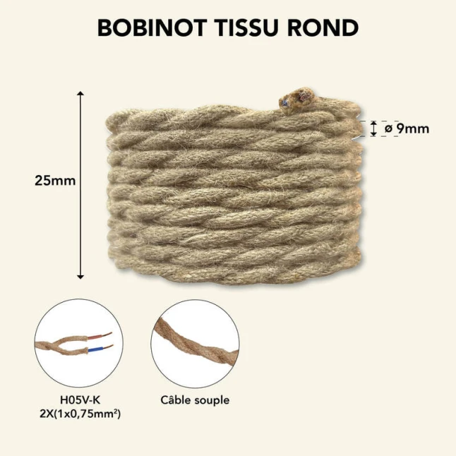 Ce cordon tissu torsadé est conçu pour l’alimentation électrique d’un luminaire, en création comme en remplacement d’un câble usé. Pour lever les doutes, retenez surtout deux repères faciles : longueur 25 m et diamètre 9 mm. Il s’intègre avec les accessoires prévus pour ce gabarit, comme les passages de câble, serre-câbles et éléments de maintien adaptés. La gaine textile protège l’aspect du câble et garde une finition régulière dans le temps.