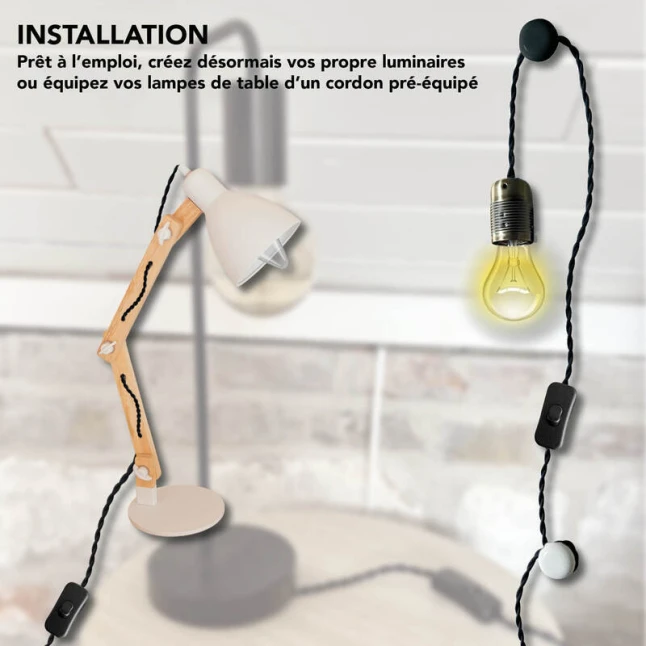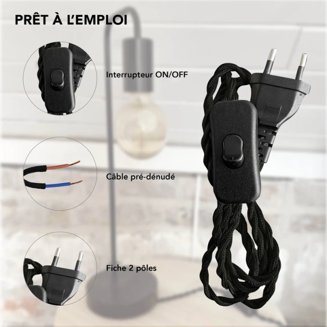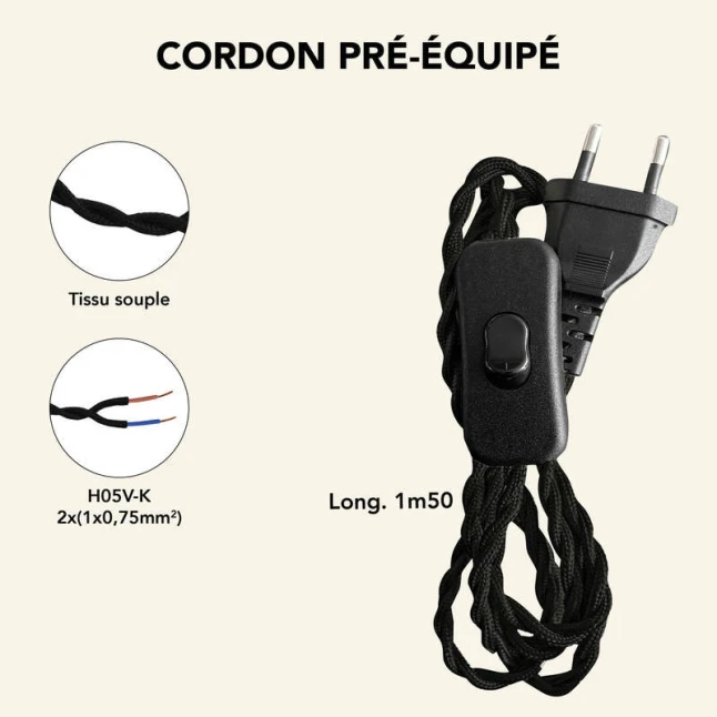 Ce kit précâblé sert à alimenter un luminaire et à gérer l’allumage et l’extinction grâce à un interrupteur en ligne. Il répond au besoin fréquent de finaliser une suspension ou une lampe DIY sans se lancer dans un câblage complexe. Le cordon électrique noir torsadé se prête aux créations déco comme aux remplacements rapides, tout en gardant un rendu propre et homogène sur un luminaire d’intérieur.