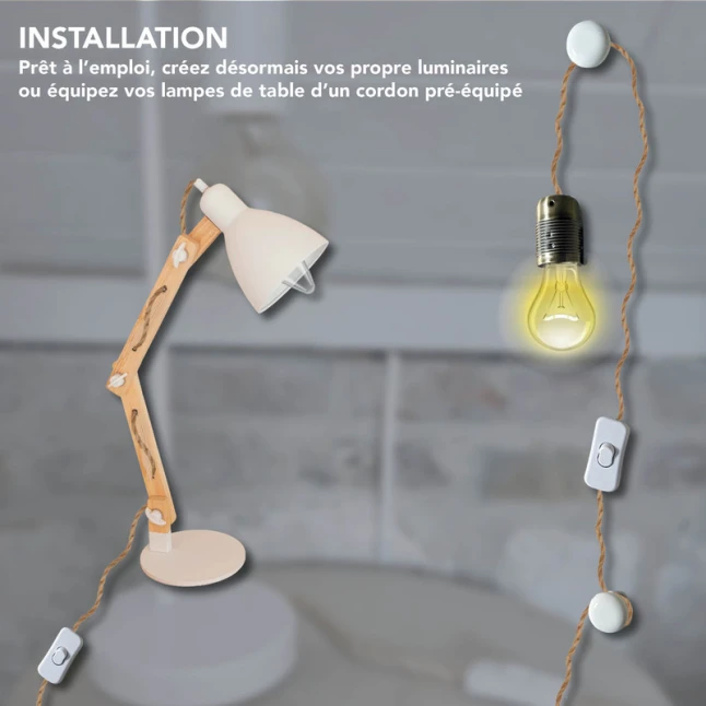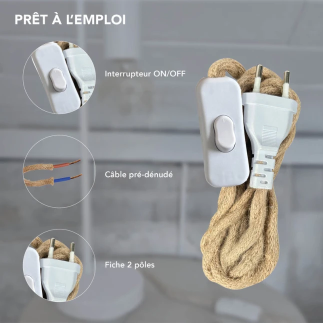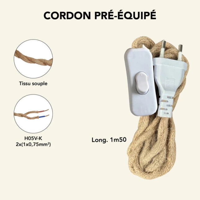 Ce kit pré-câblé réunit l’essentiel pour alimenter un luminaire et gérer l’allumage sans bricolage complexe. Le câble textile torsadé effet corde en jute, coloris beige naturel, remplace avantageusement un cordon plastique souvent jugé trop visible. Il répond au besoin fréquent de refaire une lampe ou une suspension avec une finition propre et harmonieuse, tout en conservant un usage simple au quotidien grâce à l’interrupteur sur cordon.