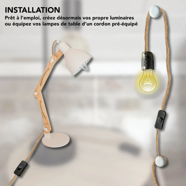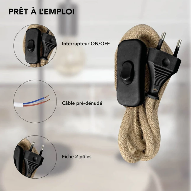 Ce kit précâblé permet d’alimenter un luminaire et de gérer l’allumage avec un interrupteur en ligne, sans assemblage complexe. Il réunit un cordon luminaire textile, une fiche 2 pôles et un interrupteur noir, déjà montés. La longueur 1,5 m offre une bonne liberté pour une suspension, une baladeuse ou une lampe à poser. Idéal quand on veut remplacer un câble usé ou finaliser un projet DIY proprement.